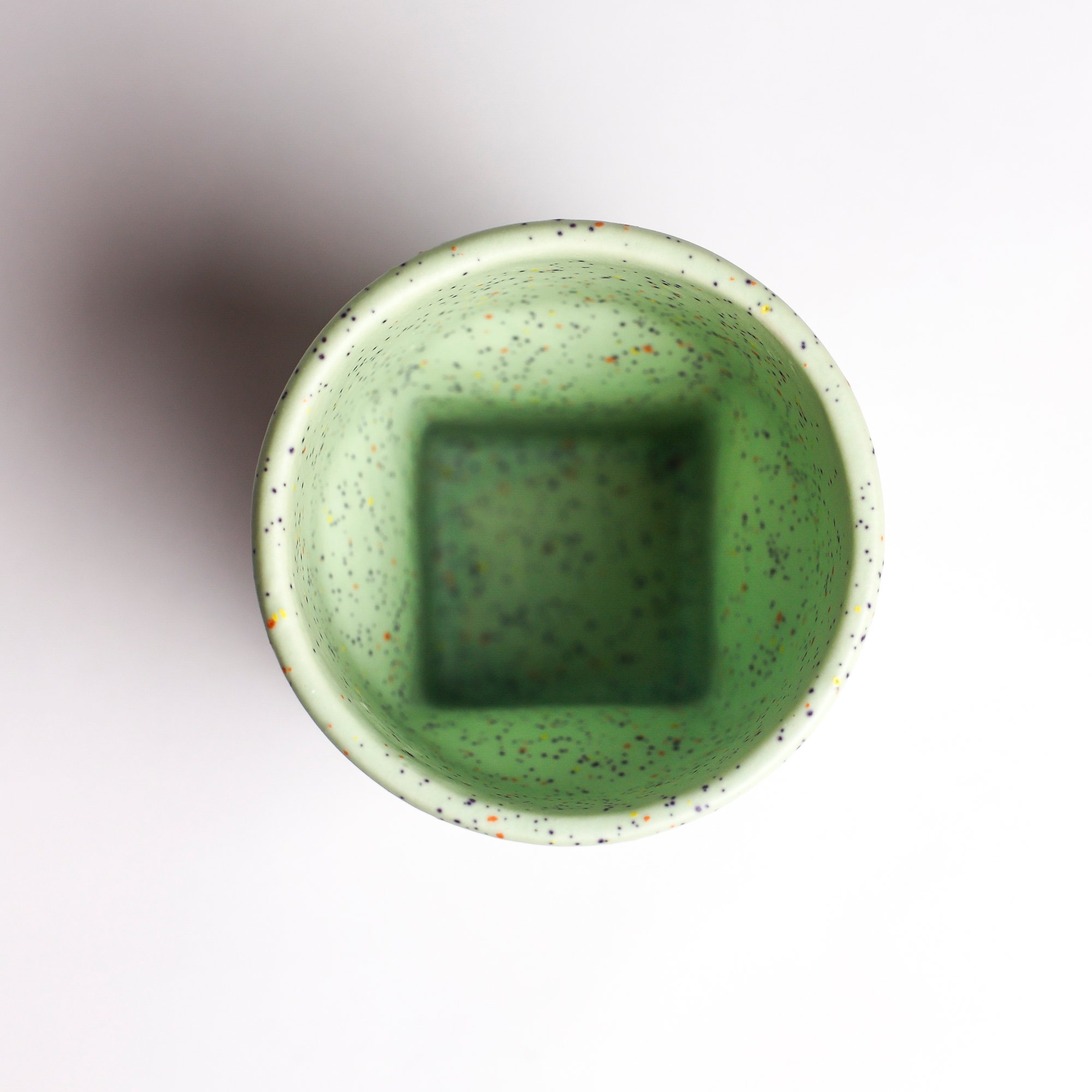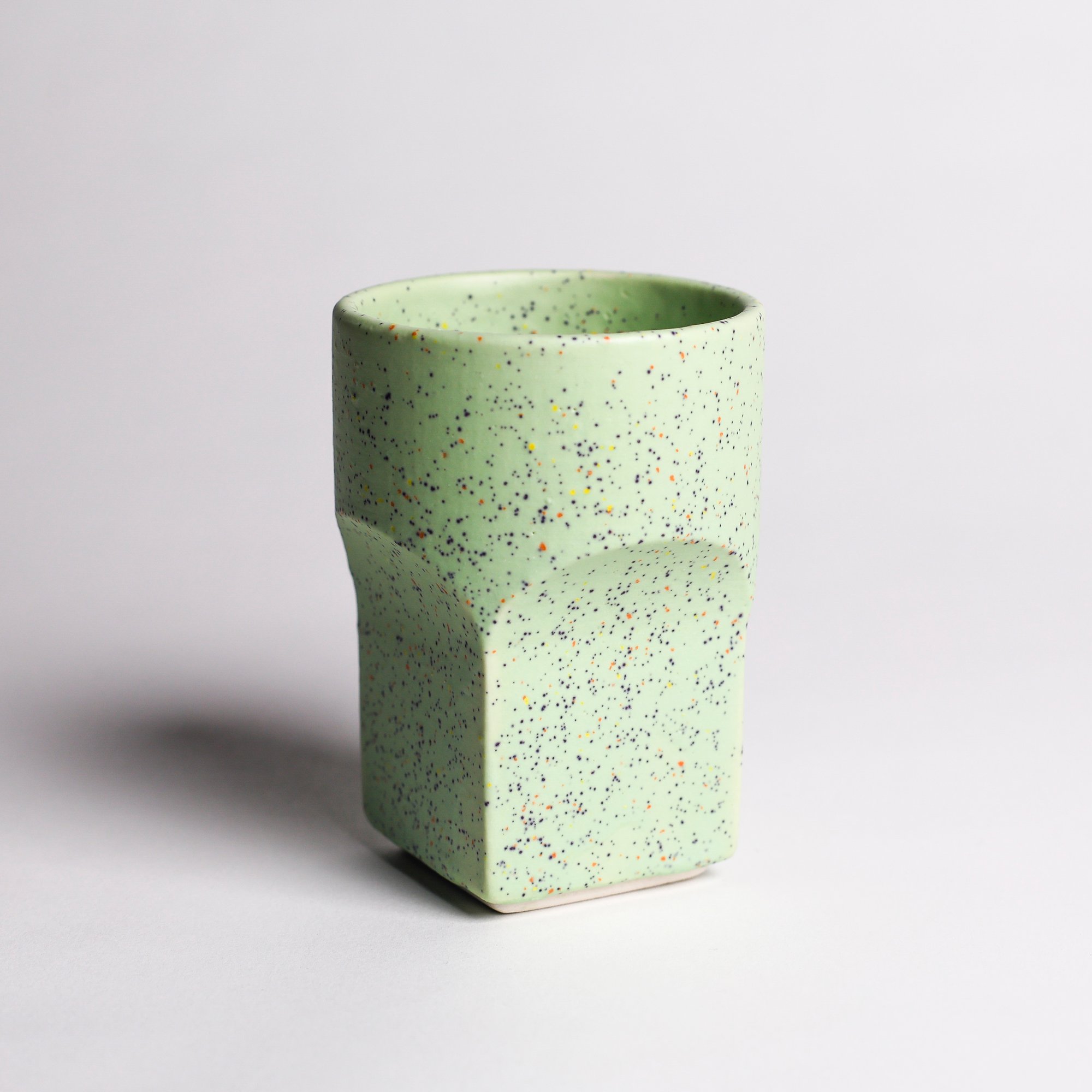 Nothing but short, clean and cute. Our first tumbler and an immediate hit. A comfy tight square base opens up in four archways to a round rim. Slipcast in stoneware with a satin matte finish speckled with tiny polka dots of purple, yellow and salmon. Coming in at a 7 ounce pour, a perfect multi-use piece for coffee, tea, water, wine, matcha, or gin and juice.
